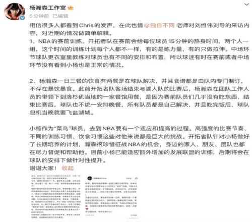 11月5日,据白鹿视频报道,@杨瀚森工作室 发文回应杨瀚森近期争议。