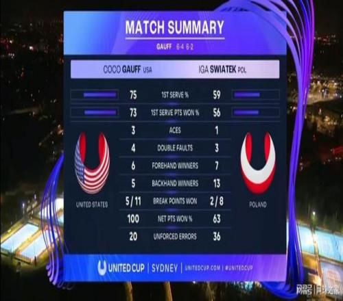 第二盘高芙连续破掉斯瓦泰克两个发球局,取得5-0的开局。第7局斯瓦泰克化解赛点破发,局分追到2-5。第8局高芙再次实现破发,6-2赢下第二盘,连续第四次击败这位自己的前“克星”。