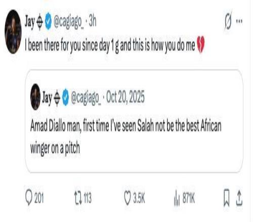 随后该枪手球迷转发他此前在2025年10月发布的一篇帖子,该帖子内容是:阿马德-迪亚洛,兄弟,这是我第一次看到萨拉赫在同一块场地上不再是表现最好的非洲边锋。