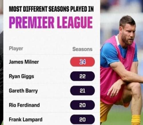 米尔纳早已超越吉格斯、巴里和费迪南德等名宿,成为英超历史上出场赛季最多的球员-9。当这两项纪录集于一身时,这位曾在曼城和利物浦获得英超冠军、在利物浦赢得欧冠奖杯的传奇球员,将被永远镌刻在英超丰碑上。