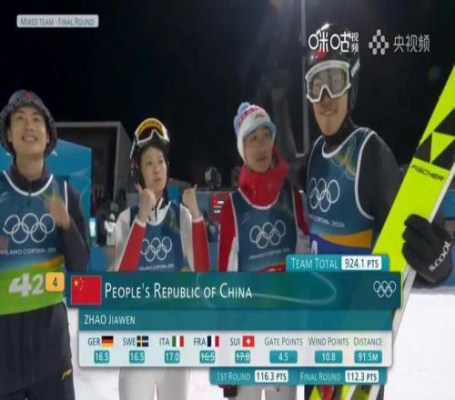 在跳台滑雪混合团体比赛中,由曾坪、宋祺武、刘奇、赵嘉文组成的中国队,也以总分924.1的成绩获得第8名,刷新中国体育代表团冬奥会该项目的最好成绩。